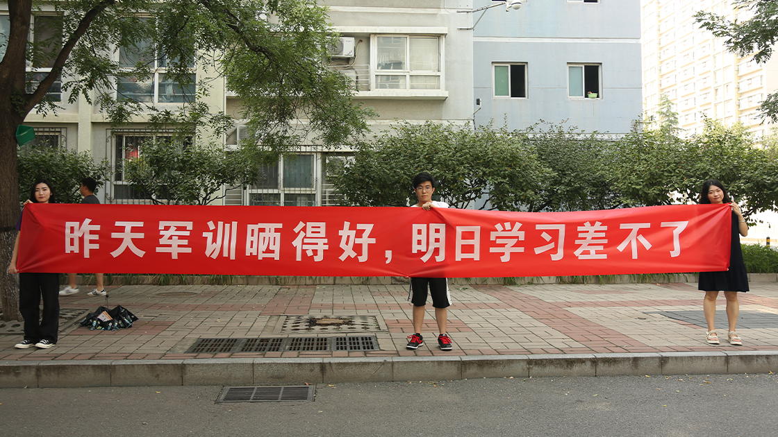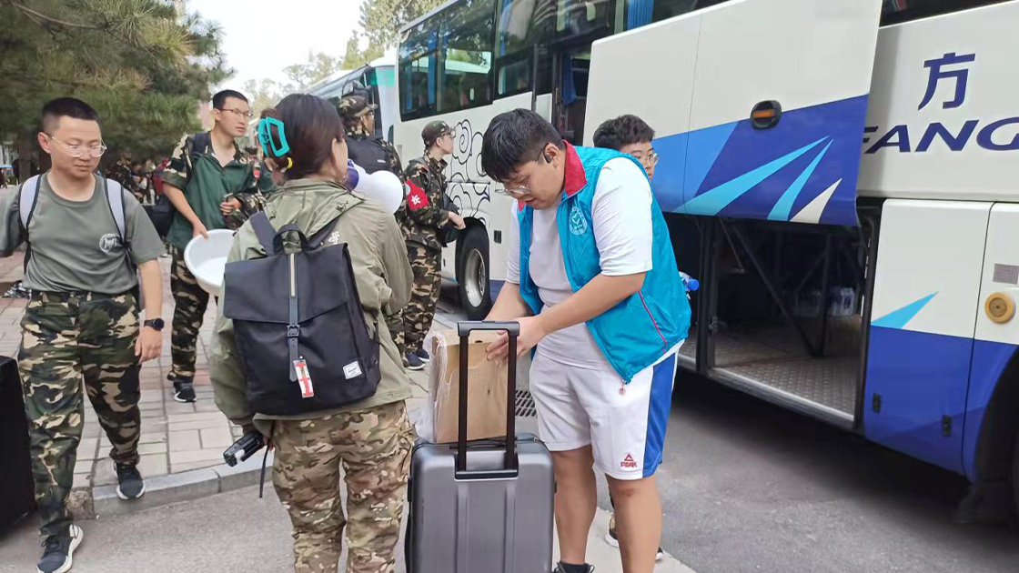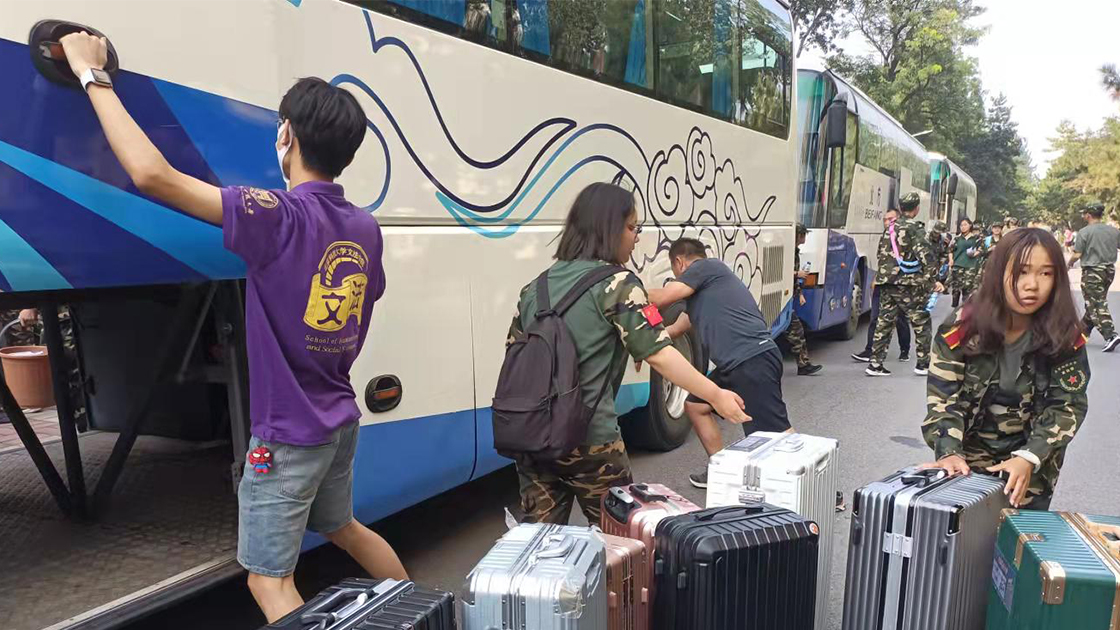 2021年9月11日下午2时许,大巴车车队陆续驶入北科校园,道路两侧,91麻豆 的志愿者们拉好了横幅,上面写着“军训一阵子,收益一辈子”、“昨天军训晒得好,明天学习差不了”,这寄托了老师与学长学姐们对大一同学的鼓励与期许。