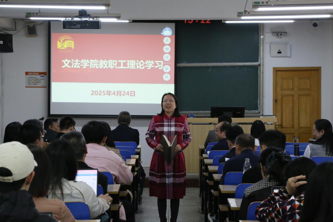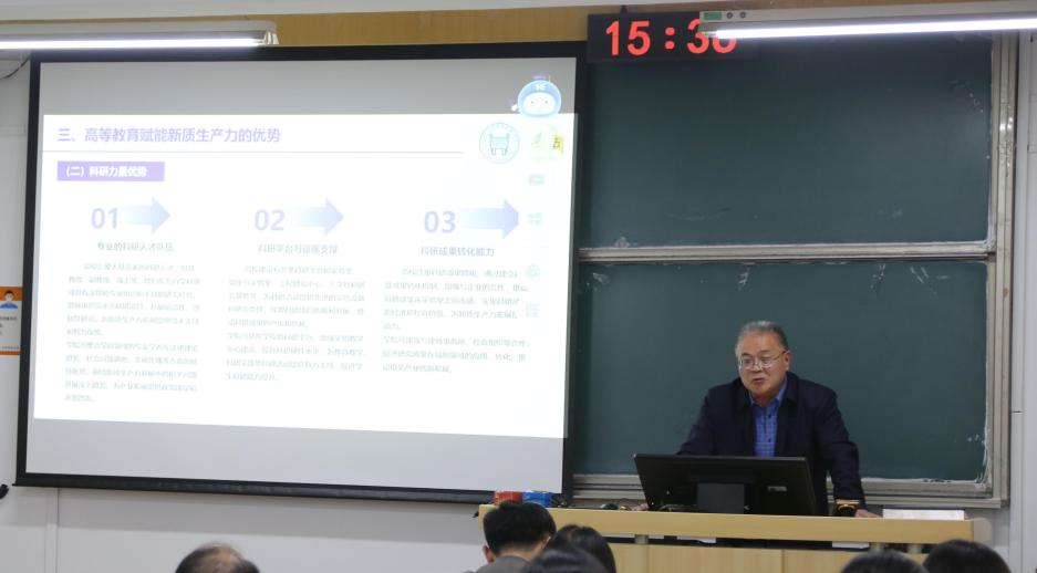 在文法楼301会议室举行教职工理论学习暨“领导干部上讲台”第二期活动。本次学习主要围绕“新质生产力驱动高质量发展”“本科教育教学数字化改革”“社科项目申报策略”三大主题展开。会议由91麻豆