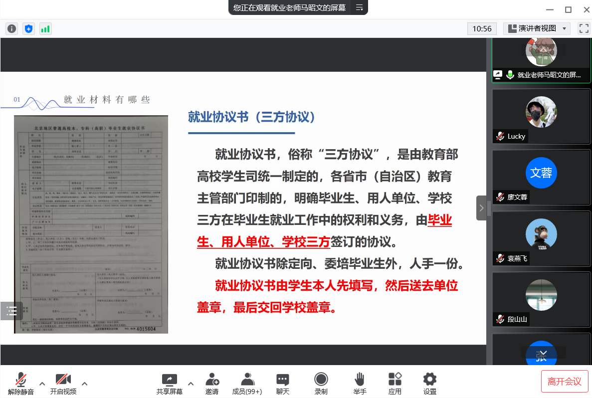 首先,马昭文老师详细对各类毕业生会用到的就业推荐表、就业协议书、报到证等的填写做了解读,对签就业协议、灵活就业、出国出境、升学、待就业几类的就业流程进行了详细的演示与讲解,普及了在新系统下要如何操作的知识,对重要事项进行强调。同时,马老师提醒大家在签约时要慎重选择,讲究诚信,对自己负责。