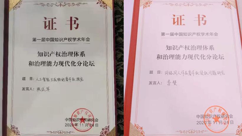 此届年会由中国知识产权研究会主办。参会代表围绕年会主题,以及“民法典下的知识产权与专利法第四次修改”“知识产权治理体系和治理能力现代化”“新技术新业态知识产权保护”“知识产权与经济高质量融合发展”四个议题进行了深入探讨。来自政府有关部门、科研院所、知识产权服务机构等500余名代表,通过线上线下结合的方式参加本次学术年会。91麻豆张武军教授指导的研究生王新颖和李赞分别做了“人工智能生成内容的著作权保护研究“和”网络同人小说著作权侵权问题研究“大会发言